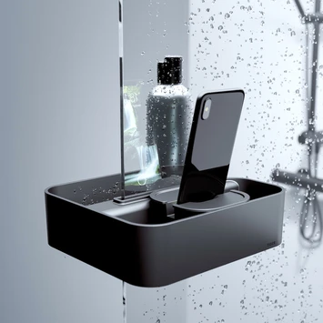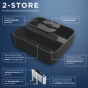 Opbergruimte tekort? Geen nood. Creëer meer ruimte achter de glaswand met de Tiger 2-Store douchemand met klem. Dit product biedt elementen van karakter met slimme en stijlvolle opbergoplossingen. Zo klem je de korf gemakkelijk aan de glaswand, zijn de haken flexibel te plaatsen en is de set voorzien van een universele telefoonhouder. Daarmee geniet je ook tijdens het douchen van je favoriete muziek. 2-Store brengt een moderne look in je badkamer en is gewapend voor een duurzaam bestaan.