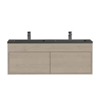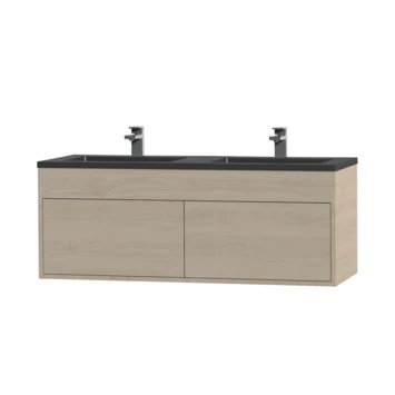 Het Tiger Helsinki badkamermeubel is een simplistisch, modern en greeploos meubel in Scandinavisch design. De wastafelonderkast is voorzien ruime lades waarin alle badkamerspullen overzichtelijk opgeborgen kunnen worden. Voor extra comfort is deze onderkast voorzien van handige ‘push to open’ lades waardoor ze al middels één simpele aanraking openen. De warme houttint geeft een sfeervol karakter aan het meubel. Daarnaast krijgt het meubel, door de voelbare houtnerf, een mooie natuurlijke uitstraling. De stakke, mat zwarte polybeton wastafel met immitatie natuursteen look maakt deze set compleet.