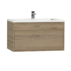 Het Tiger Helsinki badkamermeubel is een simplistisch, modern en greeploos meubel in Scandinavisch design. De wastafelonderkast is voorzien ruime lades waarin alle badkamerspullen overzichtelijk opgeborgen kunnen worden. Voor extra comfort is deze onderkast voorzien van handige ‘push to open’ lades waardoor ze al middels één simpele aanraking openen. De warme houttint geeft een sfeervol karakter aan het meubel. Daarnaast krijgt het meubel, door de voelbare houtnerf, een mooie natuurlijke uitstraling .De strak vomgegeven polybeton wastafel maakt deze set compleet.
