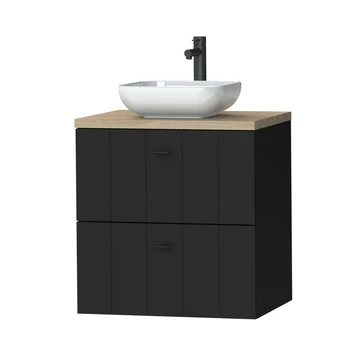 Landelijk design in een modern jasje. De Tiger Maryport wastafelonderkast van 60 cm in mat zwart en licht eiken wasblad met voelbare houtnerf zorgt voor een luxe, sfeervolle look en houdt badkamer en geest opgeruimd. Deze volledig voorgemonteerde wastafelonderkast heeft 2 ruime lades met softclose geleiders om al je verzorgingsproducten overzichtelijk in op te bergen. De half voorgeboorde gaten voor de matzwarte grepen zorgen voor een eenvoudige montage. De look wordt compleet dankzij de afgeronde wit glanzende keramische opzetkom. Deze waskom is vrijwel onderhoudsarm, hygiënisch, krasvast en bestand tegen chemische middelen.