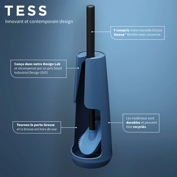 Een fris en modern gevoel in toilet of badkamer dankzij de blauwe wc-borstelhouder van Tiger Tess. Deze vrijstaande houder is voorzien van de nieuwe Swoop® flexibele toiletborstel. Met deze innovatieve borstelkop reinig je met gemak moeilijk bereikbare plekken en dankzij de vorm en het speciale materiaal van de borstel blijft er geen viezigheid achter en druppelt hij nauwelijks na als je hem terug in de houder plaatst. Draai de houder om en de borstel is niet langer meer in het zicht. Tiger Tess is innovatief en eigentijds met de herkenbare kwaliteit van Tiger.